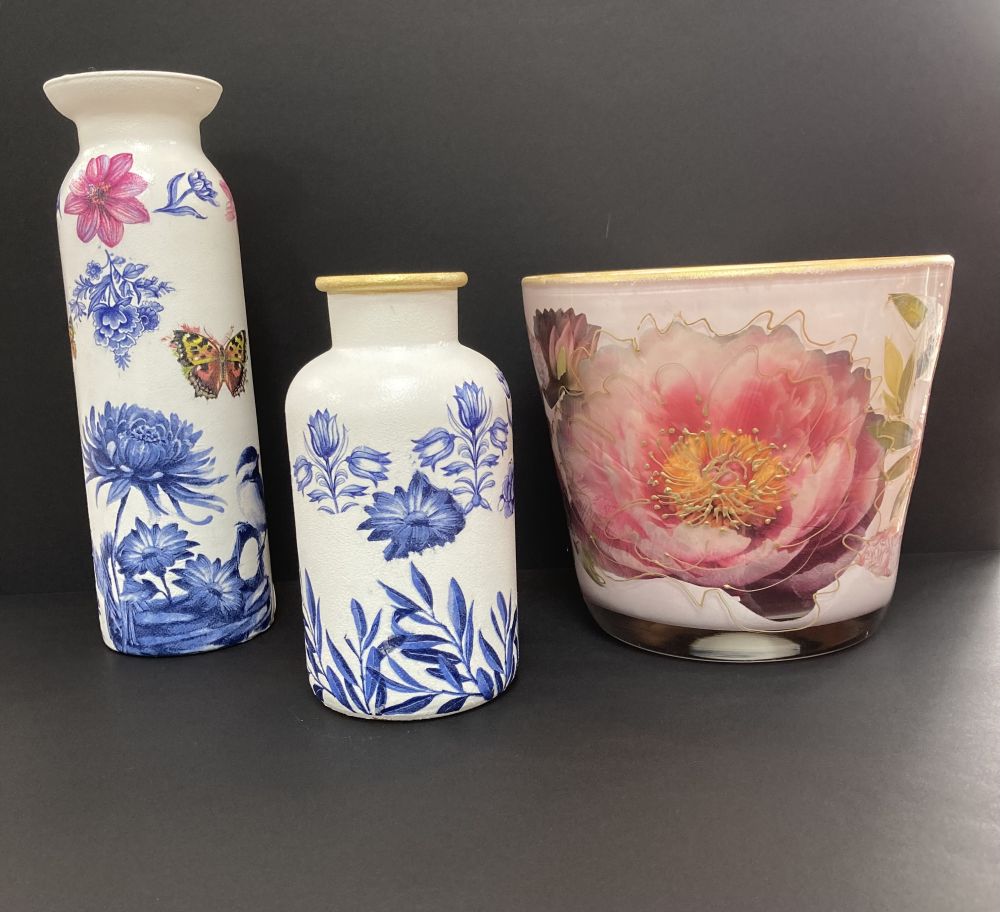 De vazen haal ik bij de kringloop dus het aanbod is verschillend. Mocht u thuis een vaas hebben en zelf servetten kunt u dit natuurlijk meenemen.